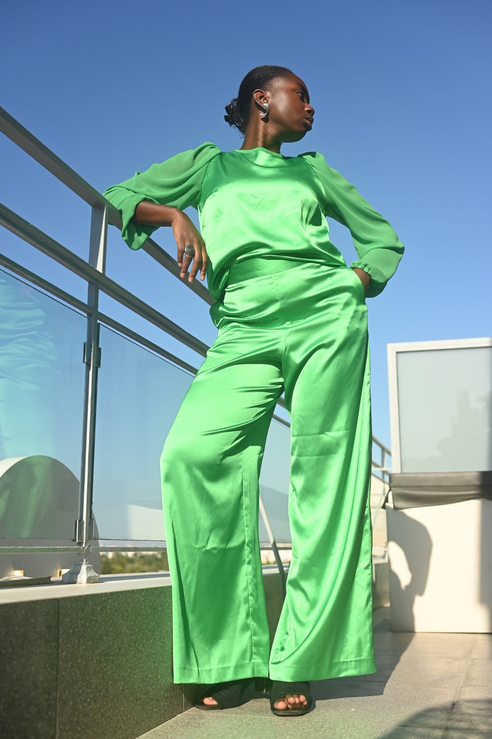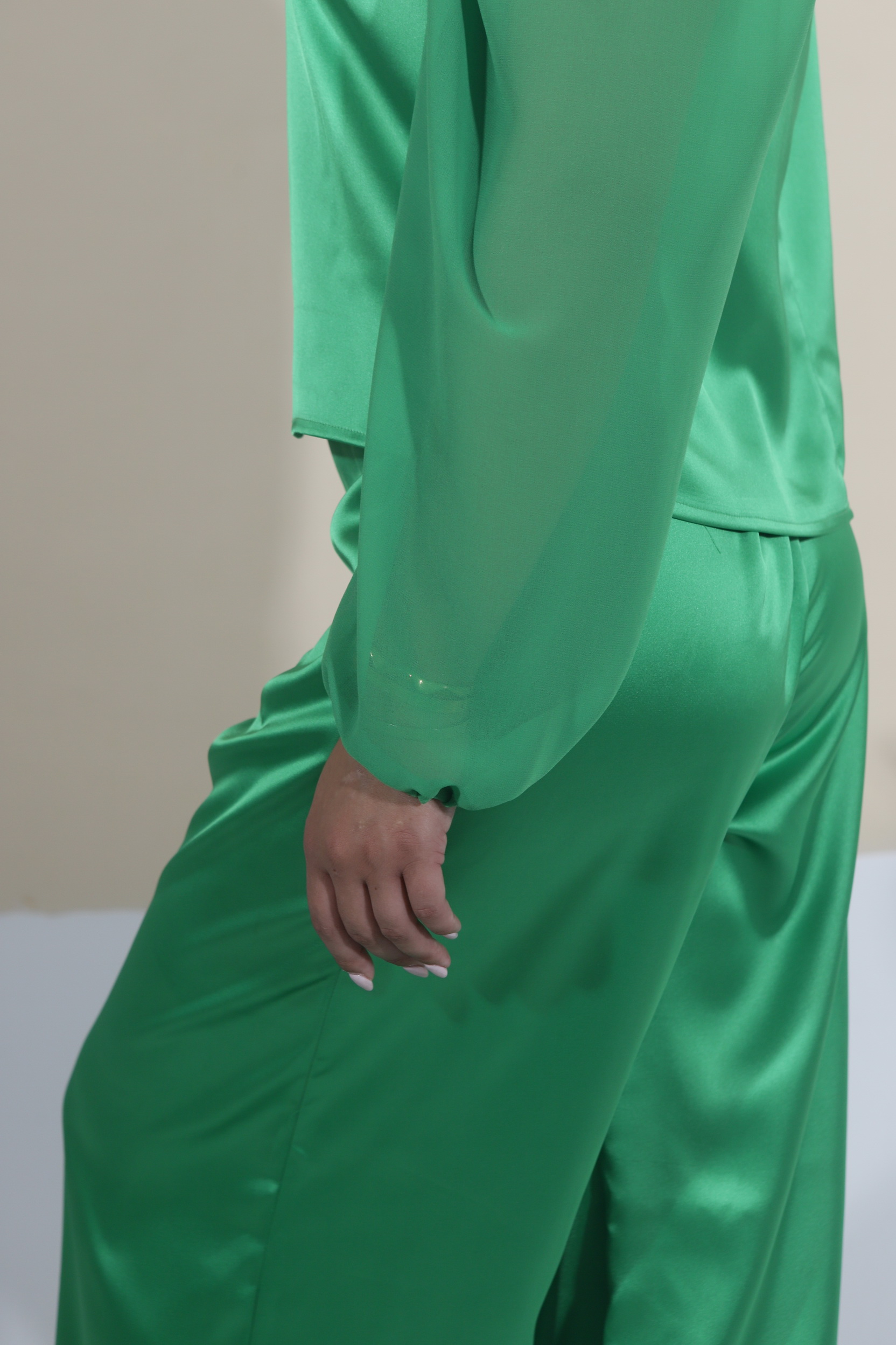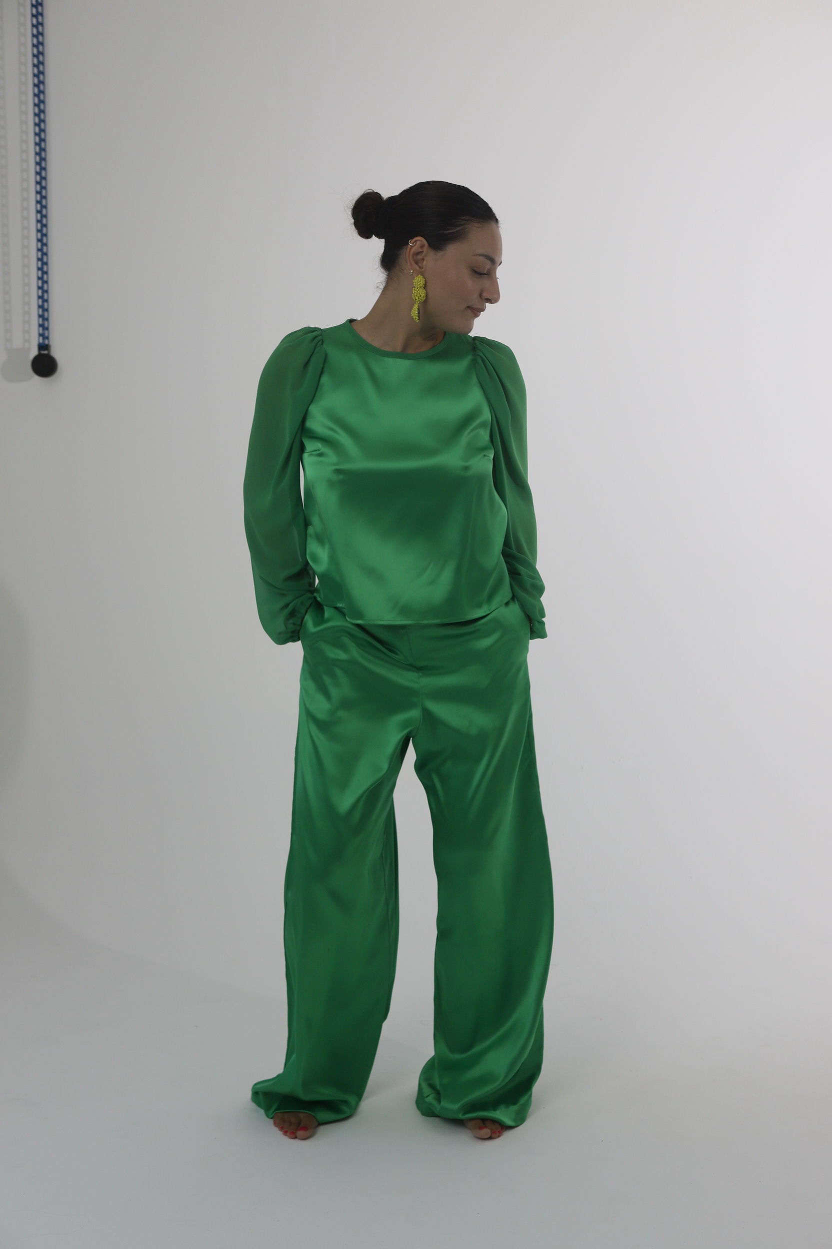 Playful yet polished, the Silence set embodies freedom of expression with a modern edge. Crafted from lustrous satin in a vibrant emerald green, the coordinated top and wide-leg trousers create a bold monochrome statement. The top features gathered puffed sleeves with subtle volume, paired with a clean neckline for balance, while the trousers flow with ease for comfort and elegance.