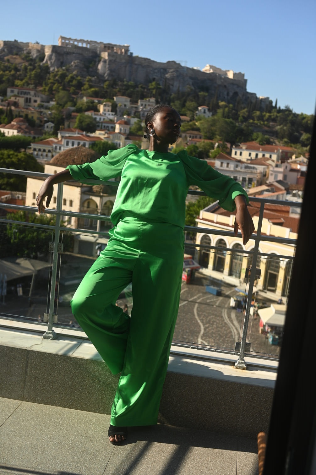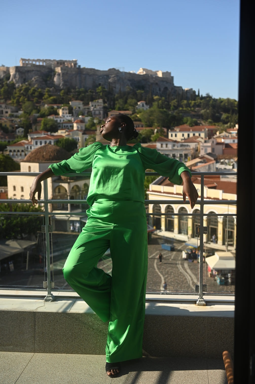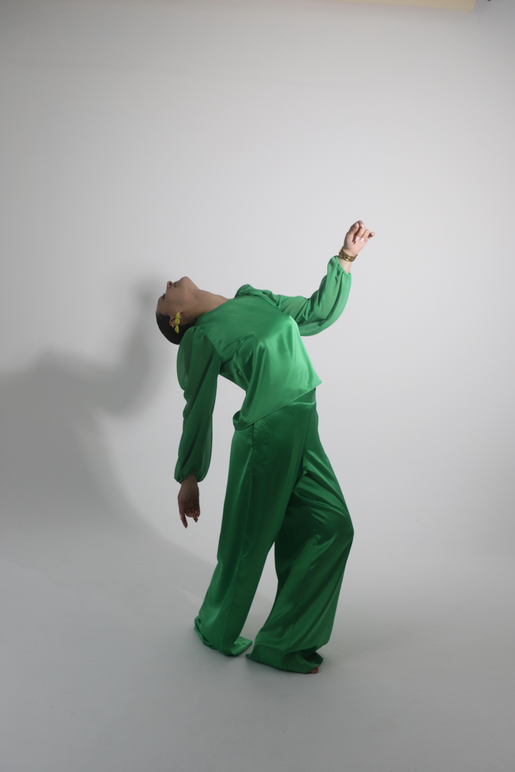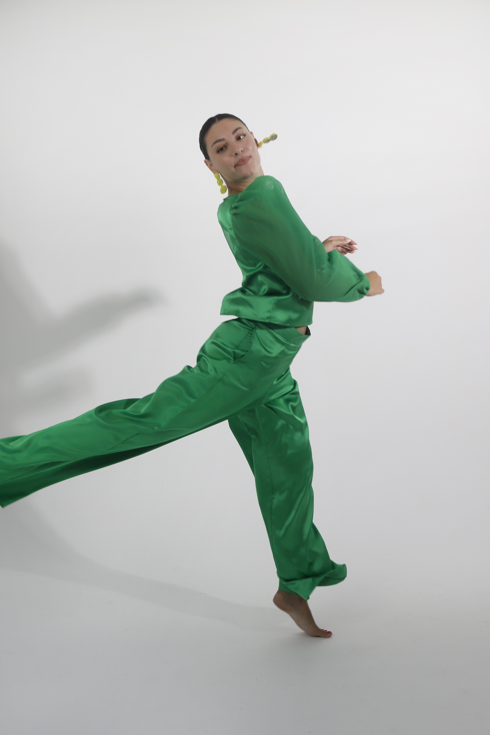 Playful yet polished, the Silence set embodies freedom of expression with a modern edge. Crafted from lustrous satin in a vibrant emerald green, the coordinated top and wide-leg trousers create a bold monochrome statement. The top features gathered puffed sleeves with subtle volume, paired with a clean neckline for balance, while the trousers flow with ease for comfort and elegance.