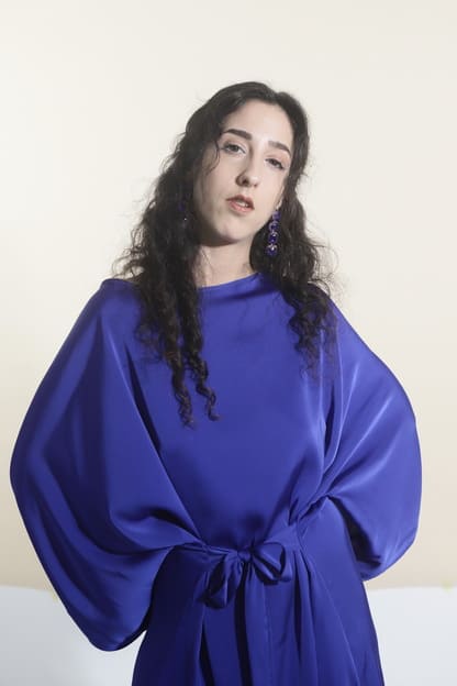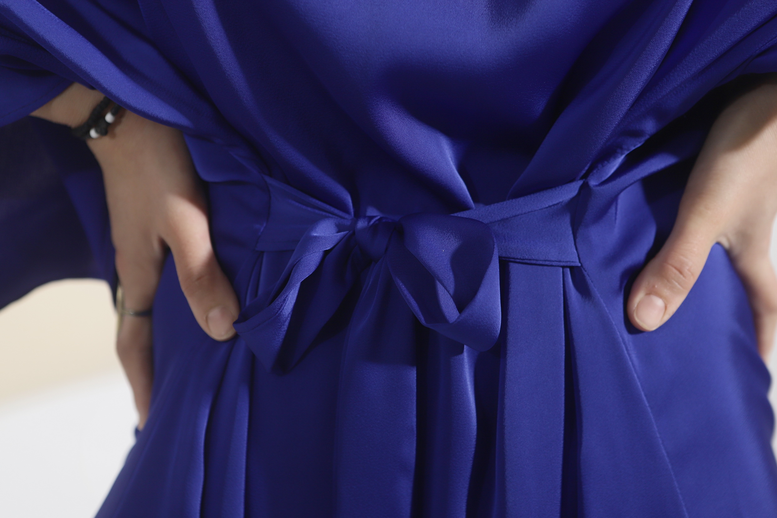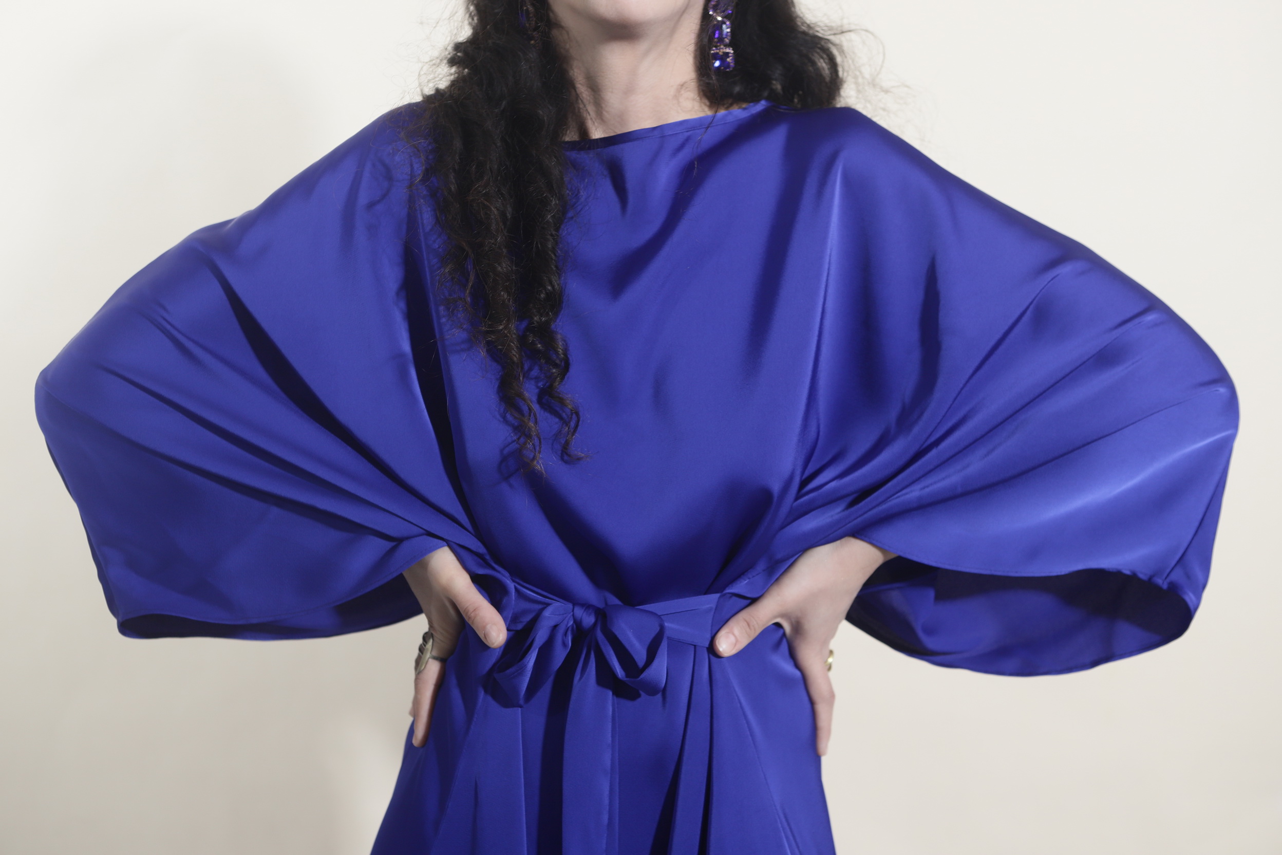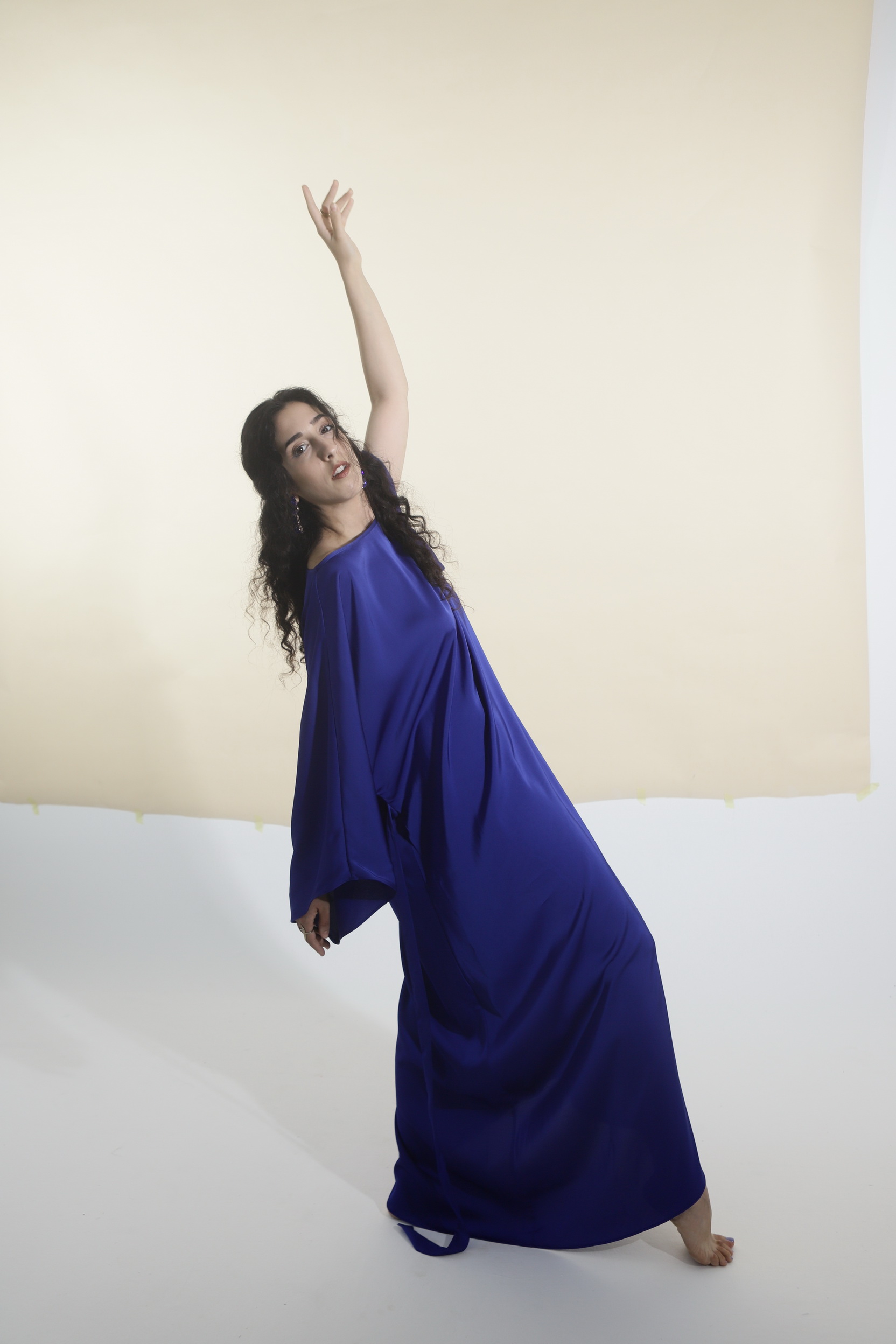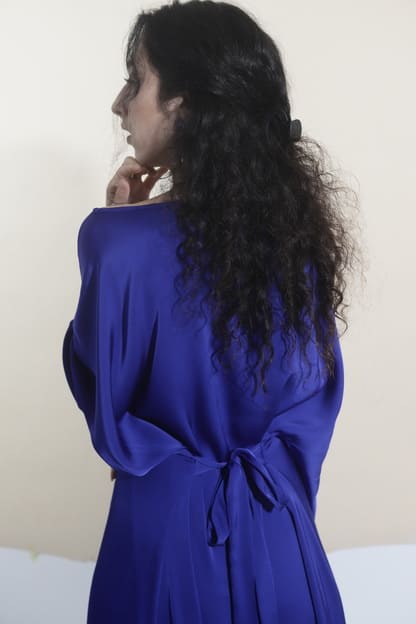 An ode to stillness and presence, the lumière kaftan is crafted from fluid satin in a deep sapphire blue that commands attention without a word. Its free-flowing silhouette is anchored by subtle structure: elongated draped sleeves, a wide cut that glides with the body, and an optional self-tie belt for versatile styling.